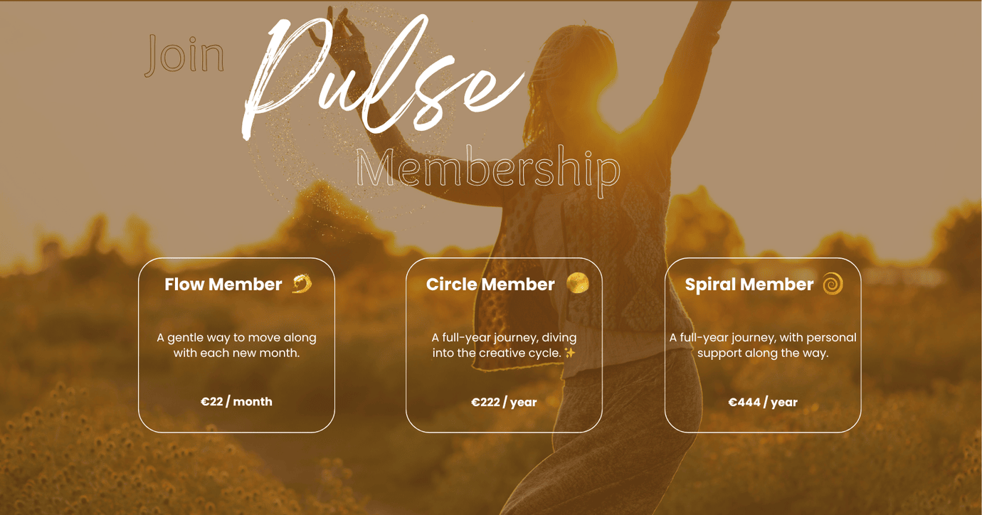 Inside the membership, the Pulse Library grows with you - a breathing archive of ecstatic dances, movement journeys, meditation, writing prompts, and creative offerings you can return to whenever you need.